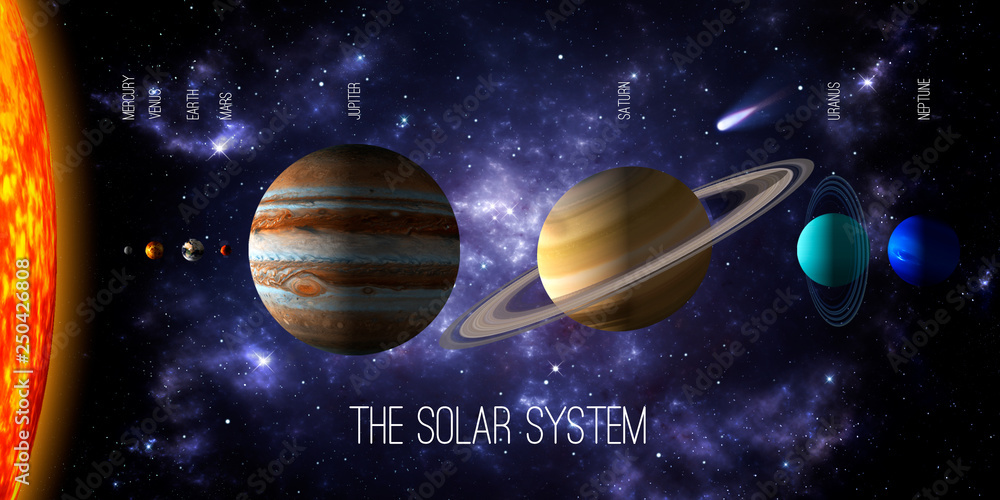 Samolepka Sun and the eight planets of the solar system with deep space and dramatic nebula background