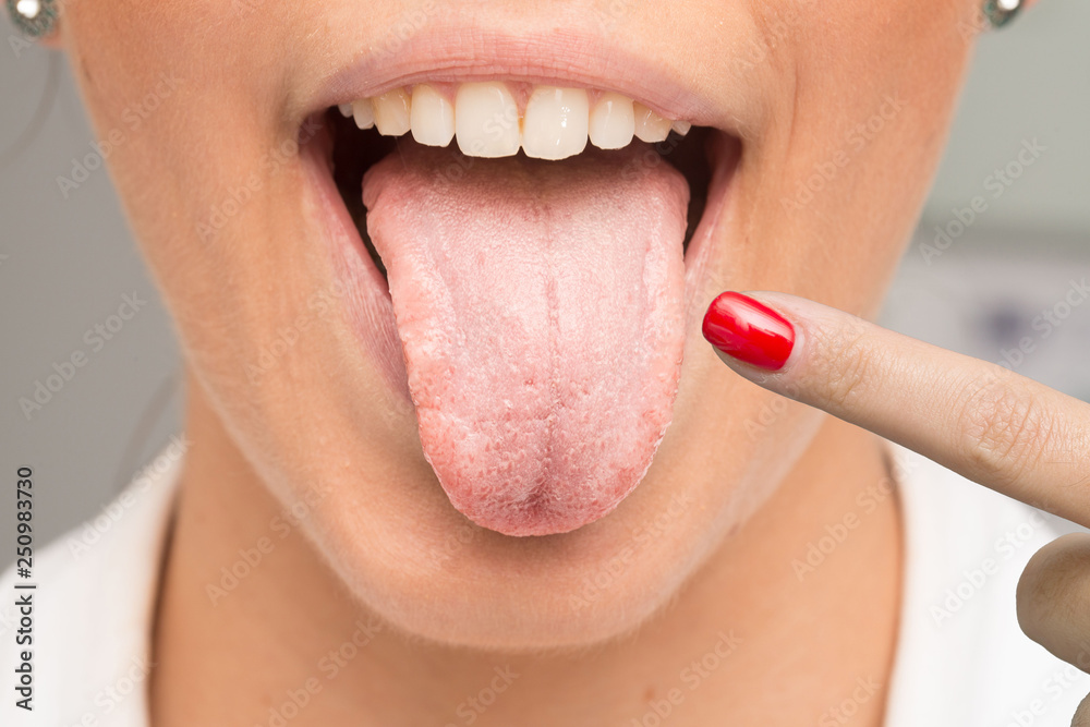 Samolepka Woman having candidiasis pointing her tongue with finger