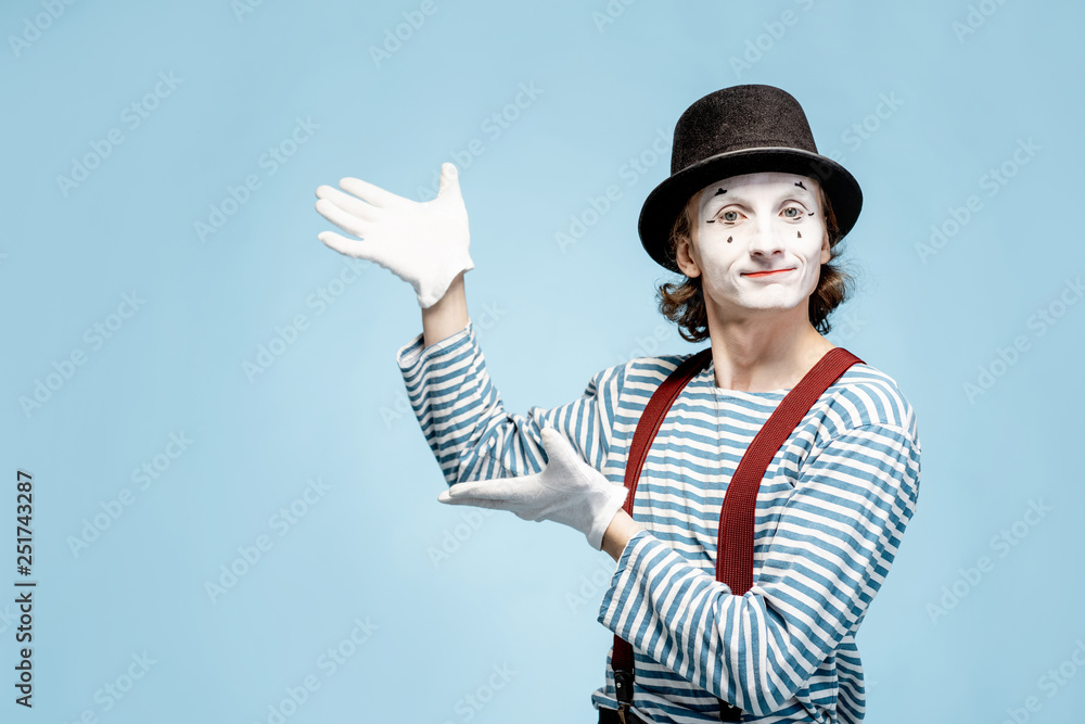 Samolepka Emotional pantomime with white facial makeup showing empty space on the blue bac
