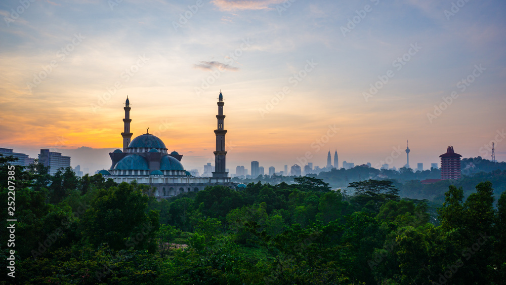 Samolepka The Federal Territory Mosque during sunrise with Kuala Lumpur city skyline on the background