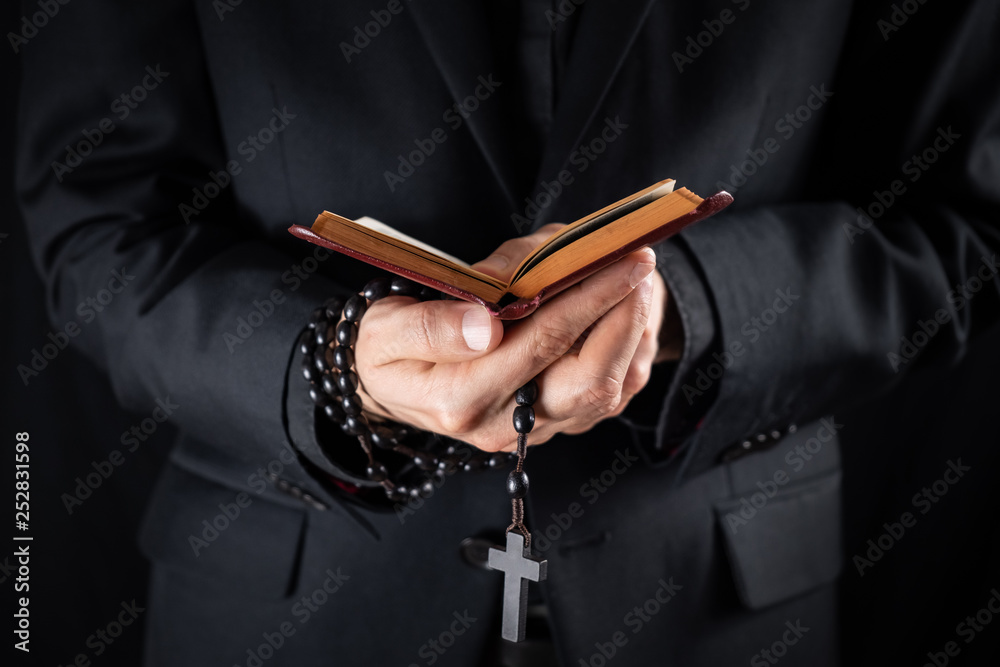 Samolepka Hands of a christian priest dressed in black holding a crucifix and reading New Testament book