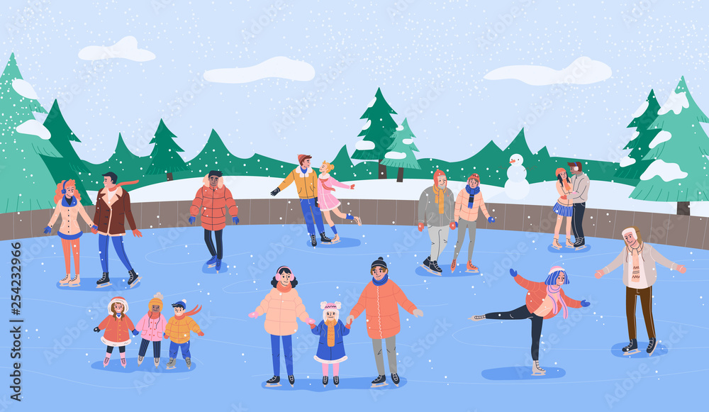 Samolepka Ice rink with various smiling people skating with their friends and families and having fun