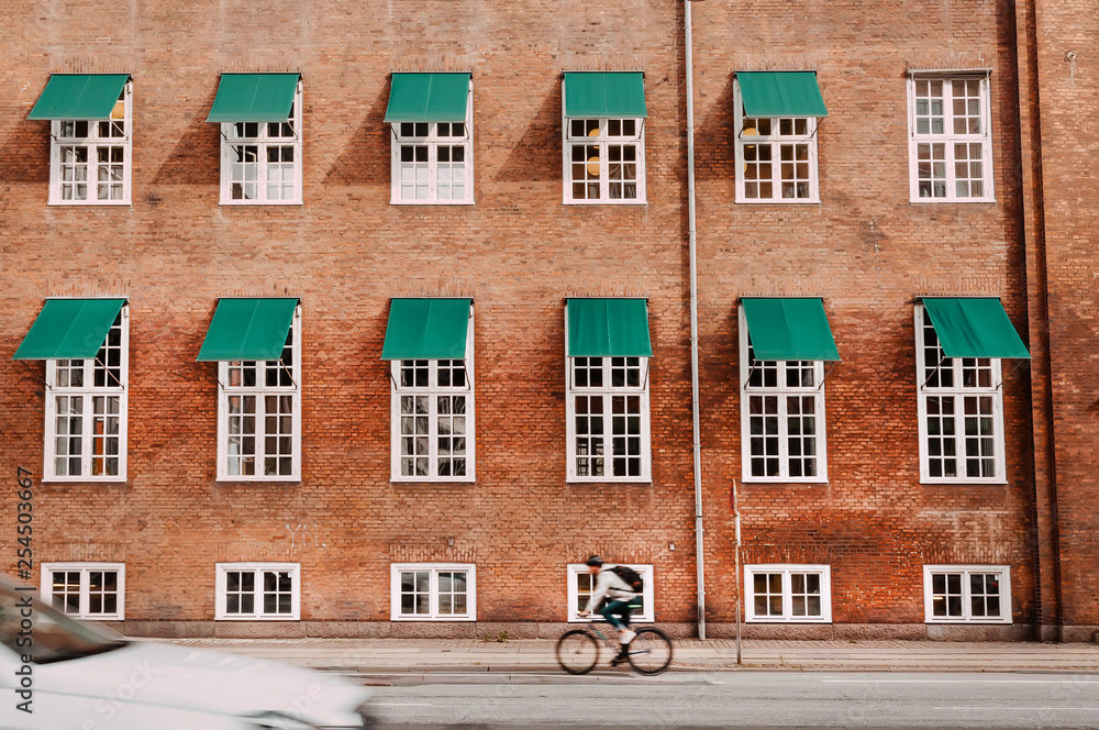 Samolepka City with brick houses and cyclists driving on historical streets of Copenhagen, Denmark
