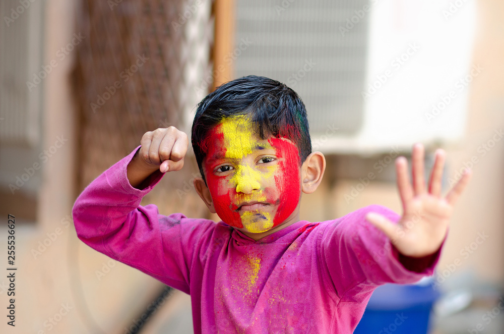 Samolepka Cute Little Indian boy child with coloured face during holi indian festival look