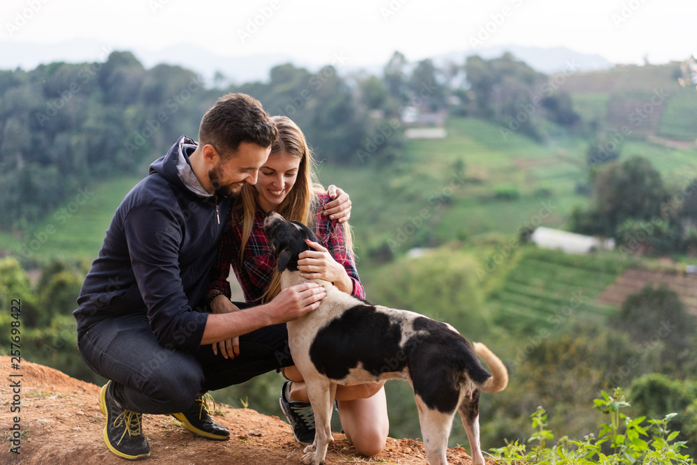 Samolepka couple in love with a dog in the mountains
