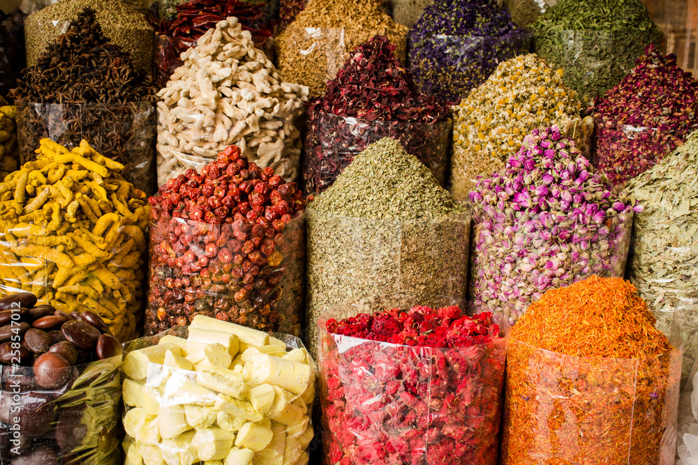 Samolepka Colorful Spices in spice souk Dubai, all dried herbs nuts and flower spices coll
