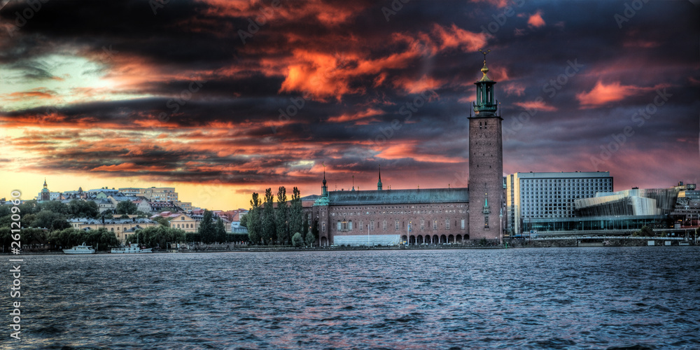 Samolepka Stadhuset Stockholm nach Sonnenuntergang