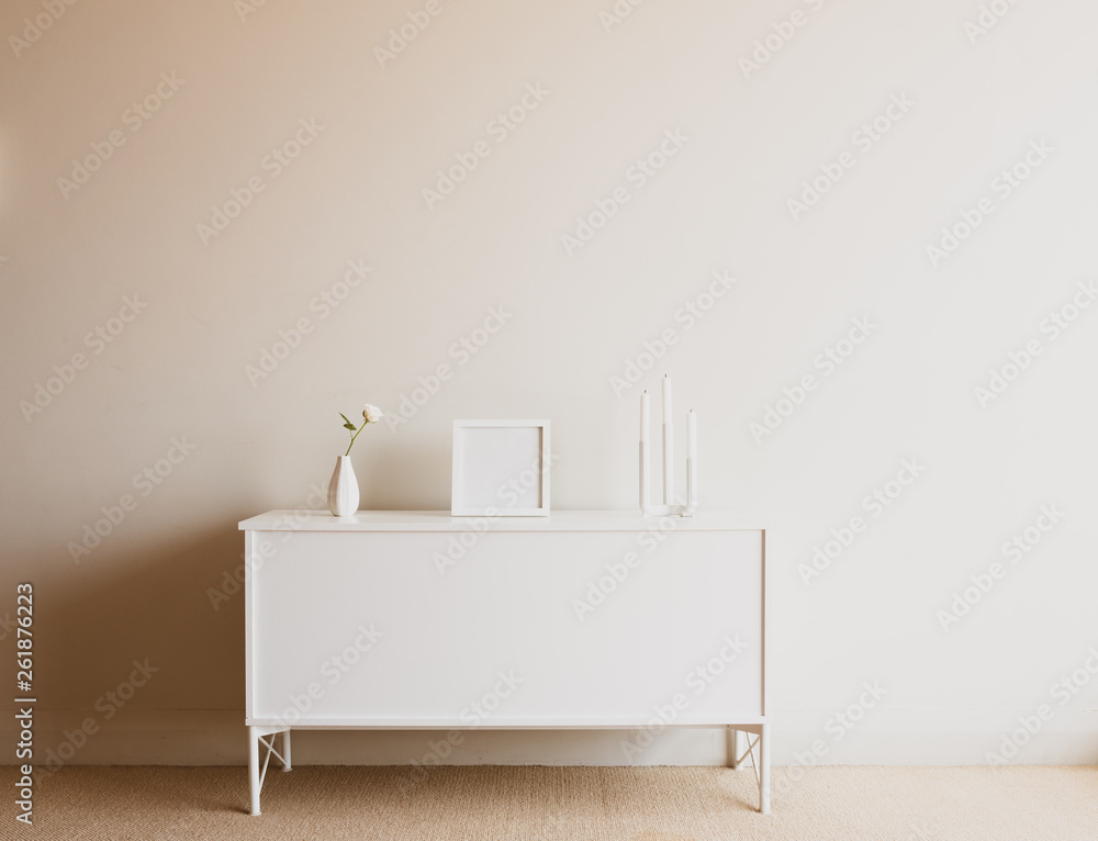 Samolepka Single rose in small white vase next to blank square picture frame and candles o
