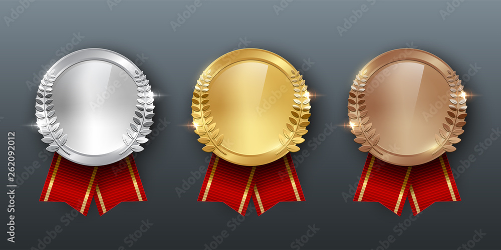 Samolepka Award golden, silver and bronze medals with ribbons 3d realistic vector color il