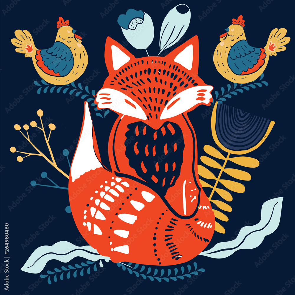 Samolepka Scandinaviat folk art with fox, nordic style blockprint imitation vector