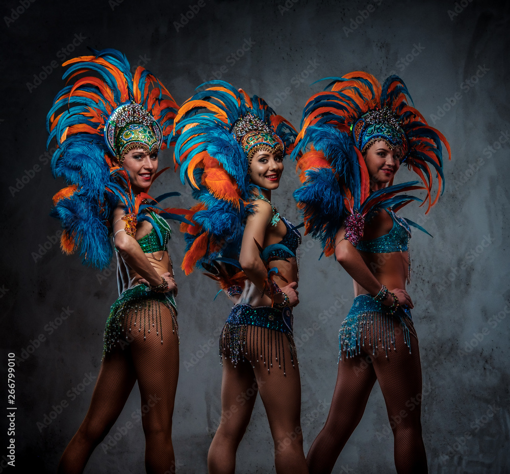 Samolepka Studio portrait of a group professional dancers female in colorful sumptuous carnival feather suits