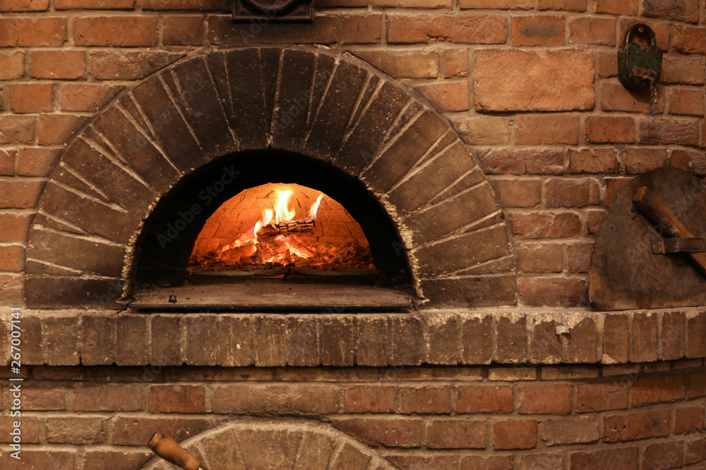 Samolepka Brick oven with burning firewood and pizzas indoors
