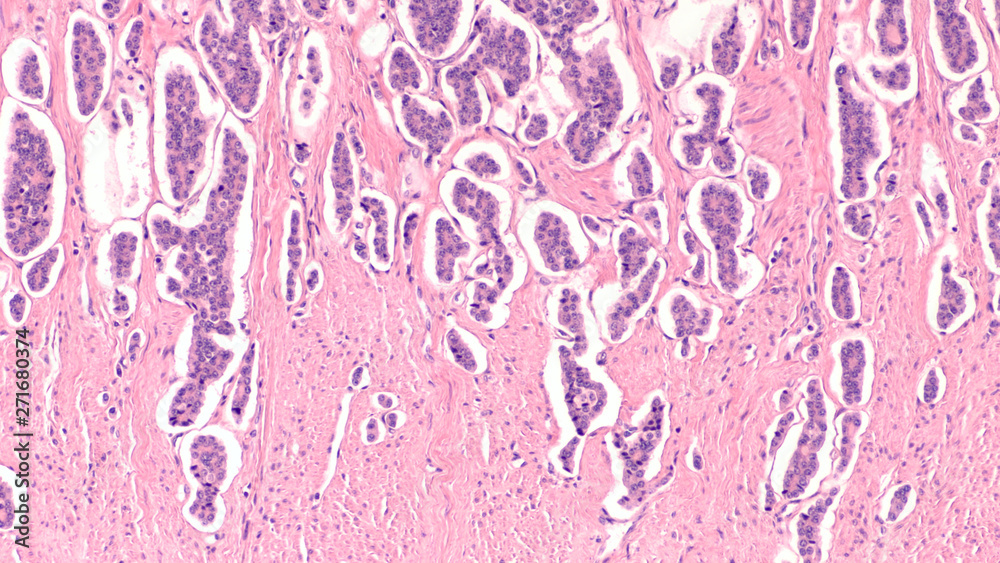 Samolepka Photomicrograph of a neuroendocrine tumor (NET, aka carcinoid) of small intestine (ileum), with invasion of smooth muscle of bowel wall