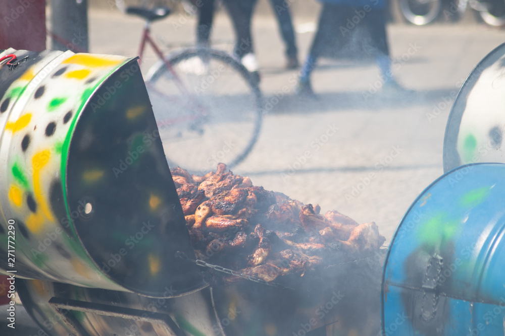 Samolepka Caribbean jerk chicken being barbecued and sold as street food.