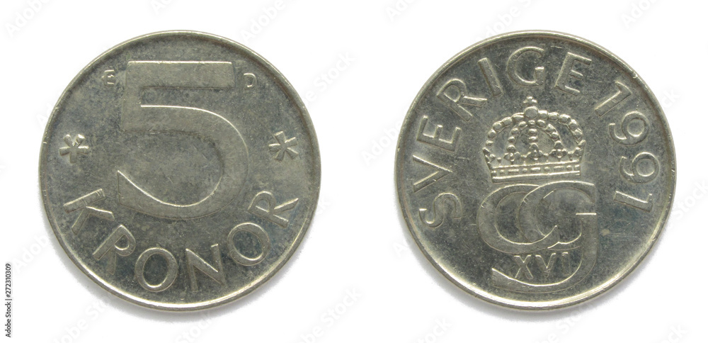 Samolepka Swedish 5 Crowns (Krona, kronor) 1991 year coin