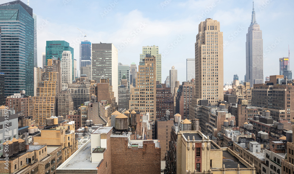 Samolepka Aerial view of Manhattan skyscrapers, New York city, cloudy spring day