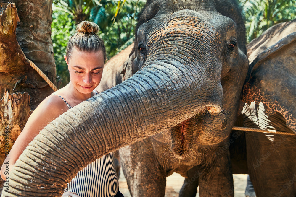Samolepka Smiling woman stroking the trunk of a large Asian elephant