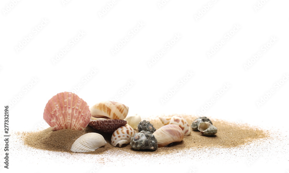 Samolepka Sea shells in sand pile isolated on white background