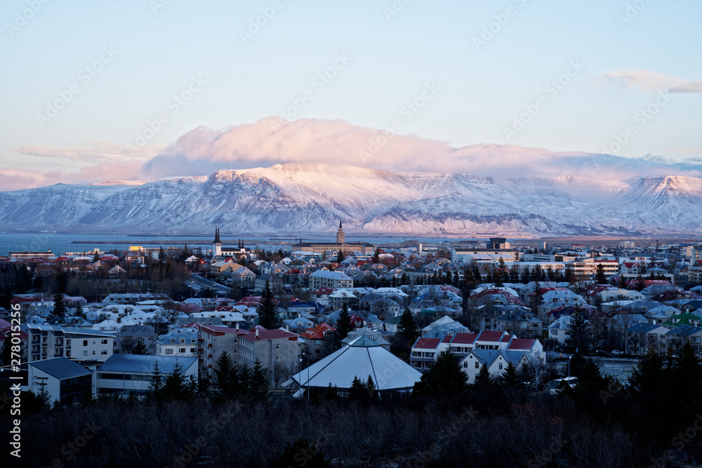 Samolepka Beautiful mountain view over Reykjavik city during sunsetin winter with view fro
