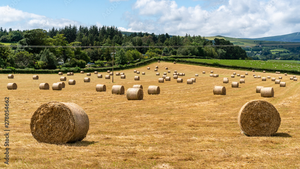 Samolepka Golden farmland field with round straw and hay bales after the crop harvest