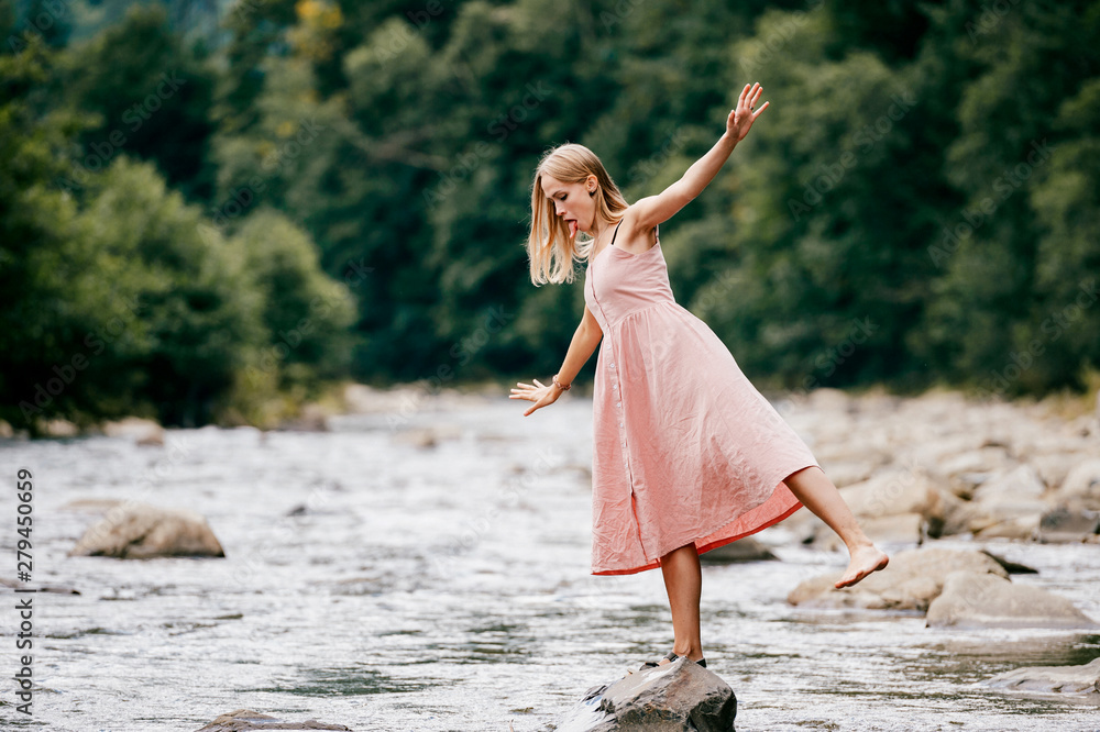 Samolepka Young graceful ballerina girl balancing on stone in the river.
