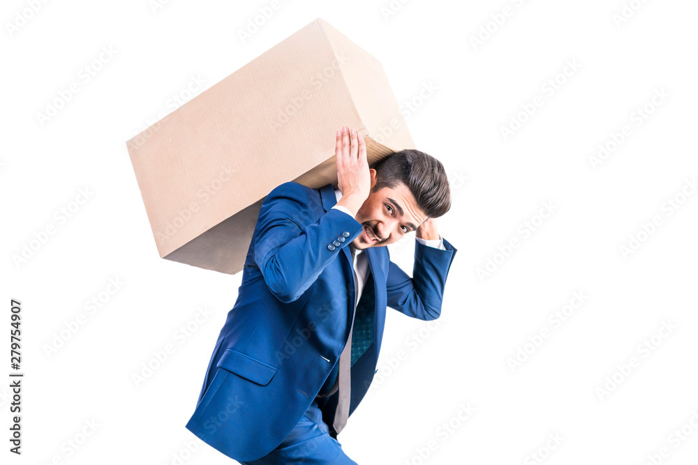 Samolepka Attractive young man in a blue suit carries a cardboard box on his back