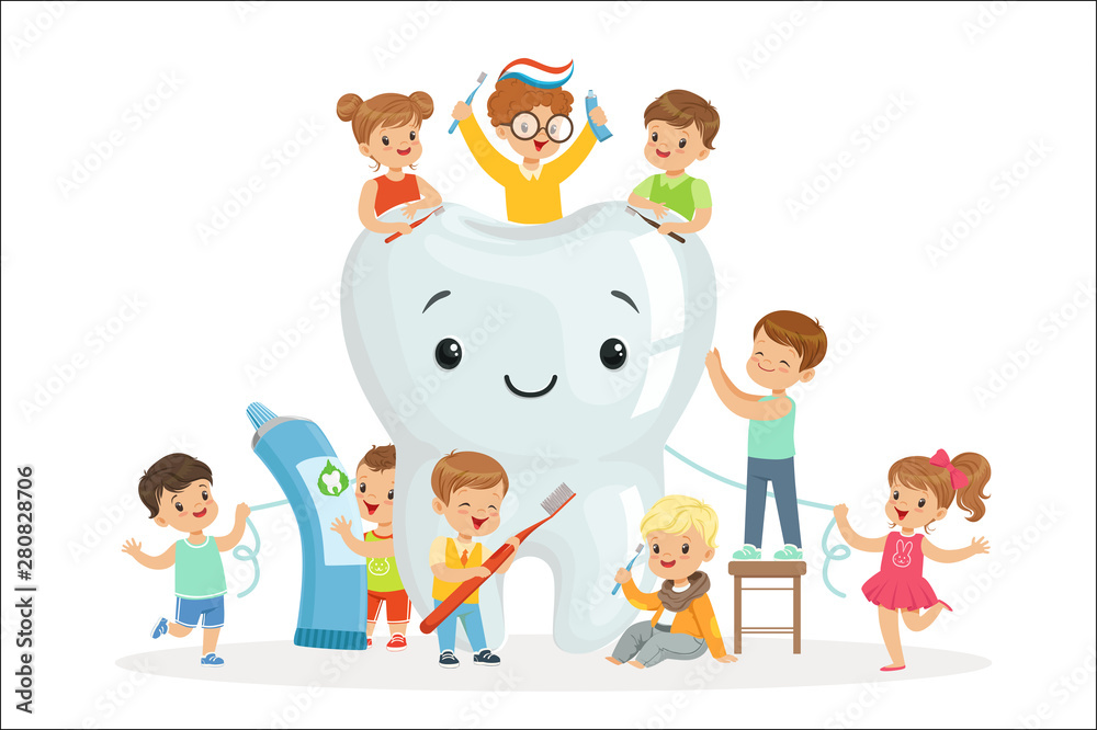 Samolepka Little children take care of and clean a large, smiling tooth