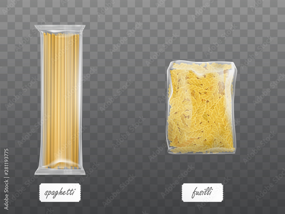 Samolepka Pasta in limpid package set, dry packaged fusilli macaroni spirals and spaghetti isolated on transparent background, design elements for food advertising