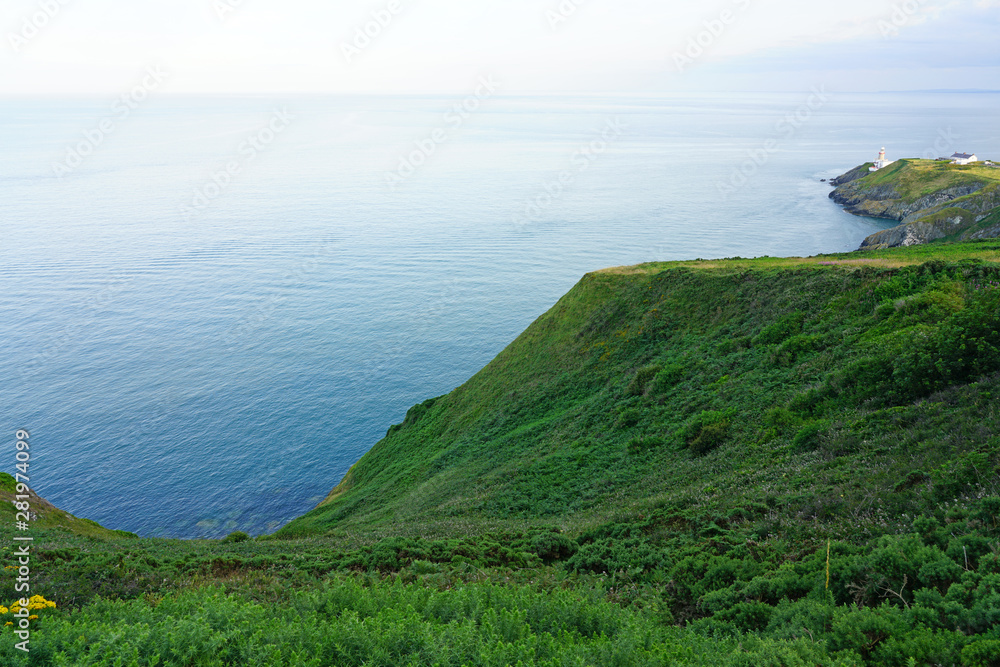 Samolepka View of green heather fields, the Baily Lighthouse and the Irish Sea seen from t