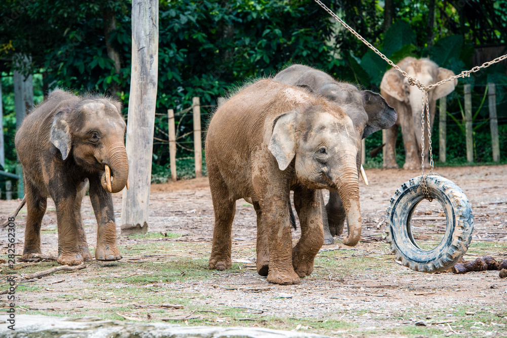 Samolepka Playful elephants at the zoo in Borneo, Malaysia