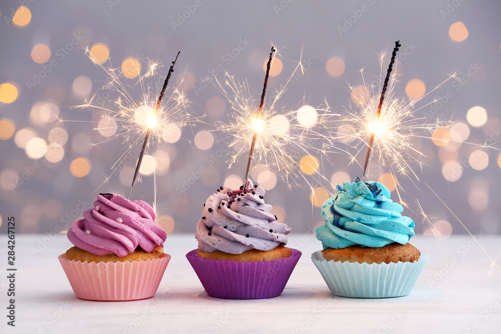 Samolepka Tasty Birthday cupcakes on table against defocused lights
