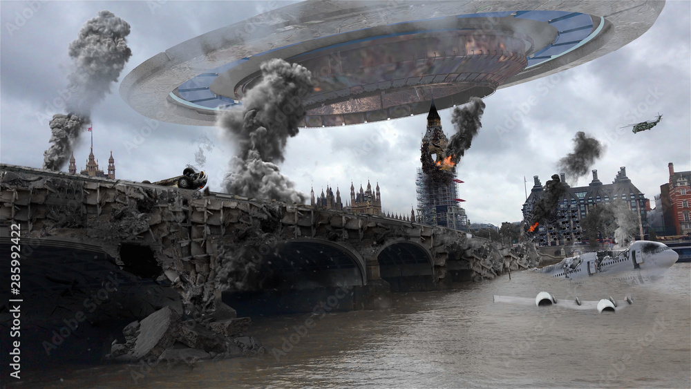 Samolepka Alien Spaceship Invasion Over Destroyed London City Illustrattion