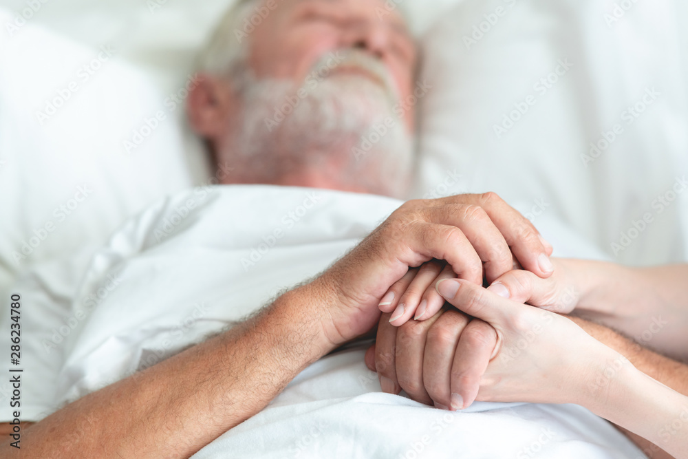 Fotografie Senior man in bed with nurse in retirement home