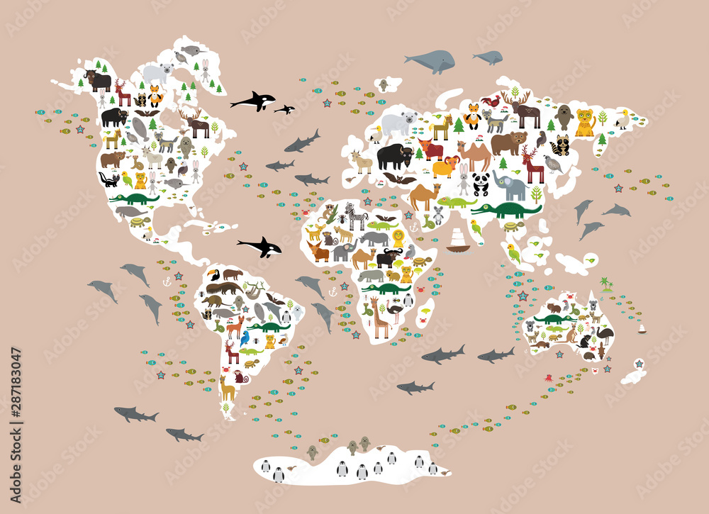 Samolepka Cartoon animal world map for children and kids, back to schhool