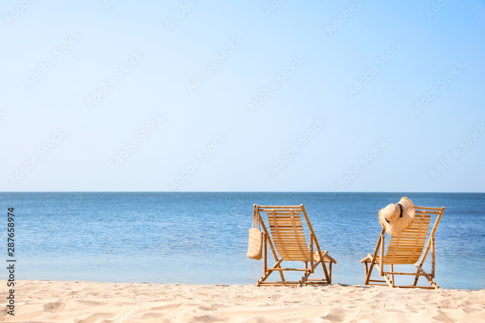 Samolepka Wooden deck chairs on sandy beach near sea