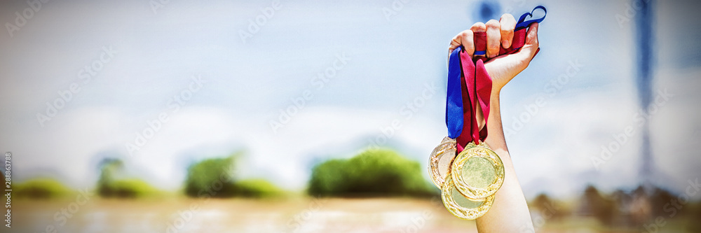 Samolepka Hand of female athlete holding gold medals