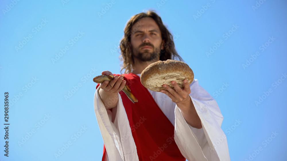 Samolepka Jesus showing fish and bread, biblical story, miracle about feeding thousands