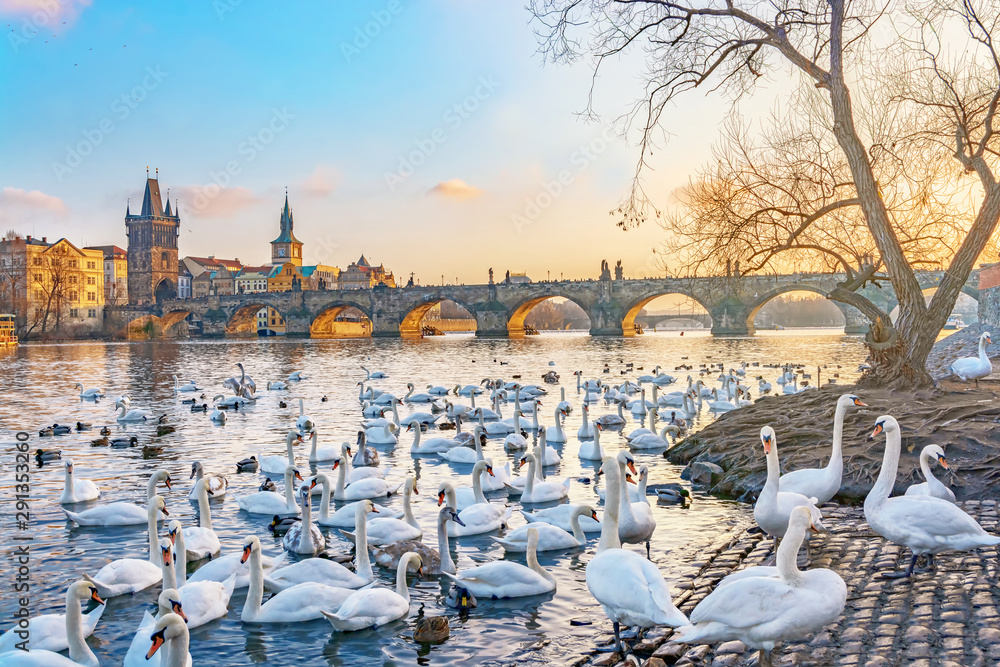 Samolepka View on Charles bridge and swans on Vltava river in Prague at sunset, Czech Repu