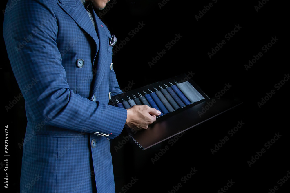 Samolepka The dressmaker is choosing the fabric to cut the suit