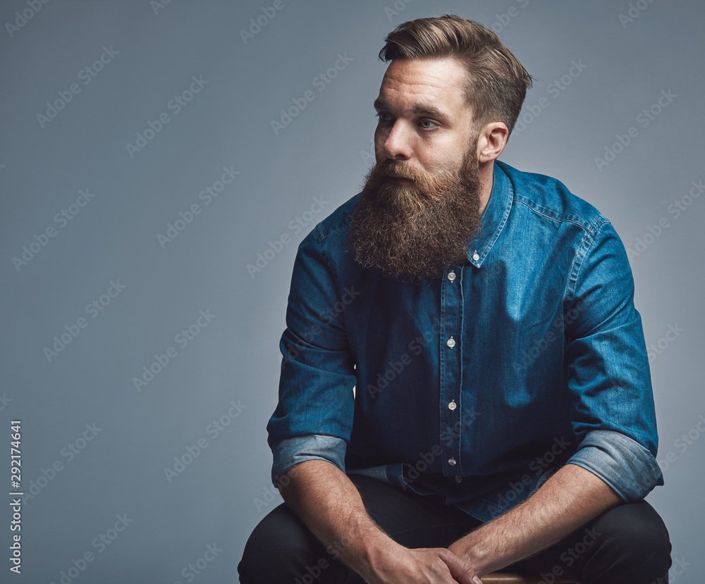 Samolepka Young man sitting pensively against a gray background