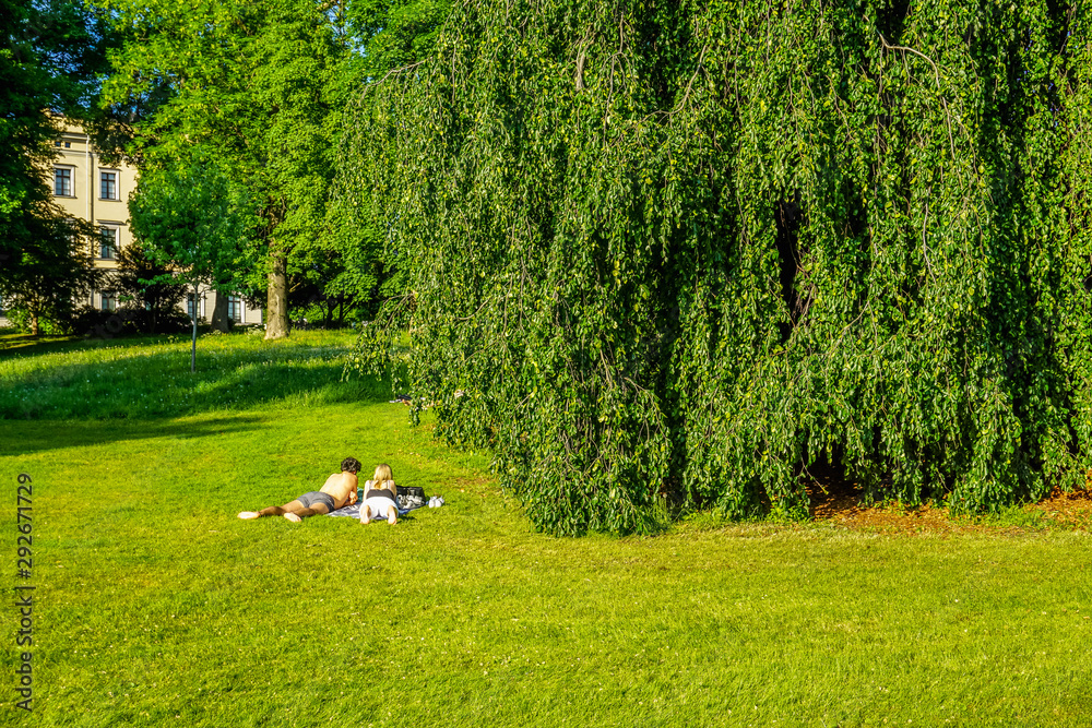 Samolepka Palace park in Oslo, Norway. People lying on the green lawn.