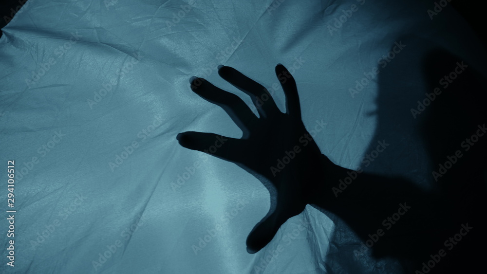 Samolepka Creepy night scene: A woman's silhouette behind the fabric, a hand suddenly hits