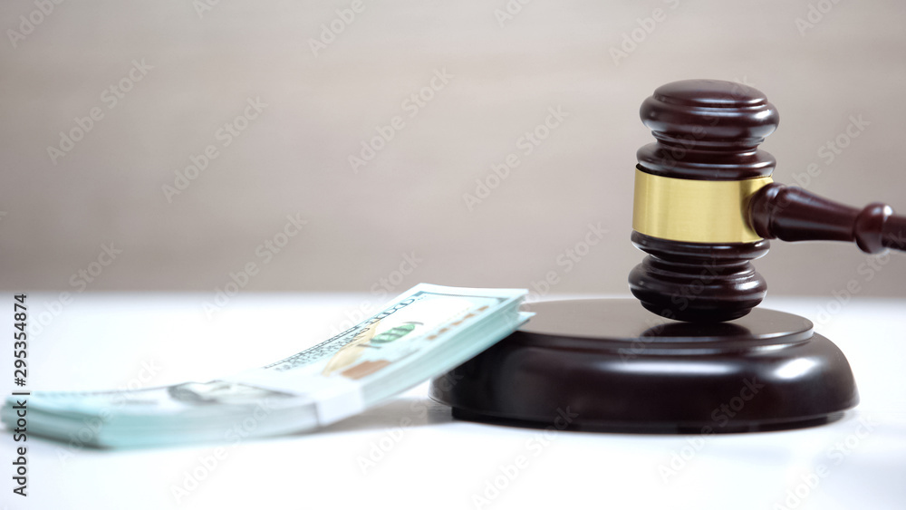 Samolepka Bunch of dollars on table, gavel standing on sound block, damage compensation