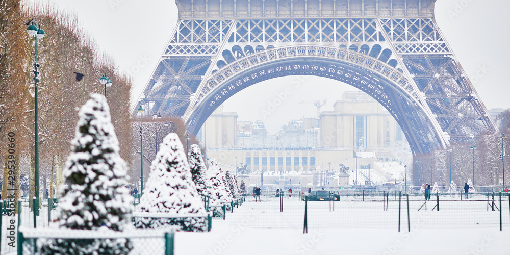 Samolepka Scenic view to the Eiffel tower on a day with heavy snow