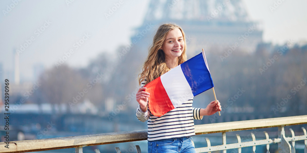 Samolepka Girl with French national tricolor flag near the Eiffel tower