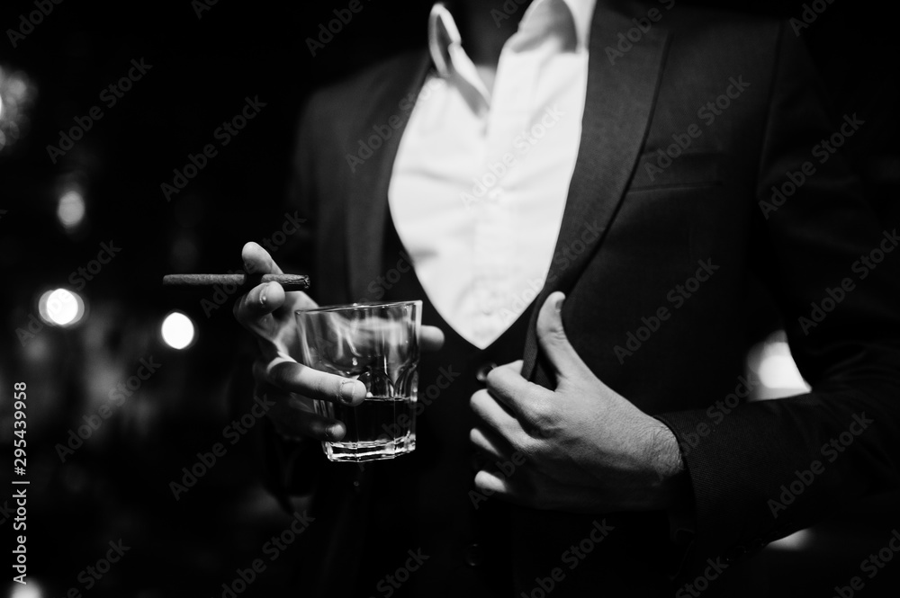 Samolepka Close up hand of handsome well-dressed arabian man with glass of whiskey and cigar posed at pub