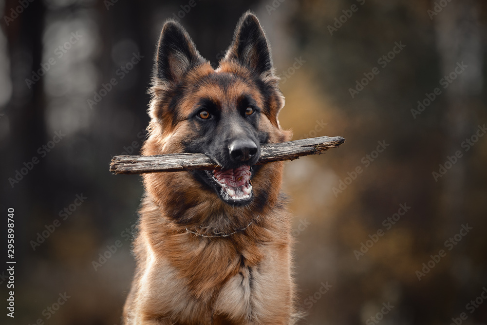 Samolepka close portrait of beautiful young long haired female german shepherd dog running