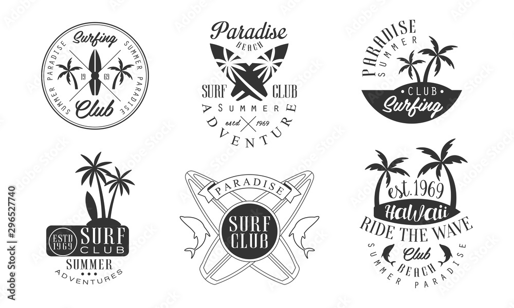 Samolepka Surfing Club Retro Logo Templates Set, Paradise Beach Club Summer Adventures Mon