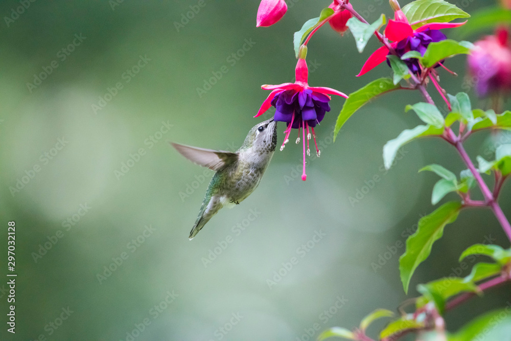 Samolepka Calliope hummingbird feeds on the nectar of fuchsia flowers