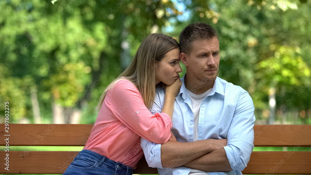Samolepka Girlfriend apologizing boyfriend sitting outdoor, relations misunderstanding